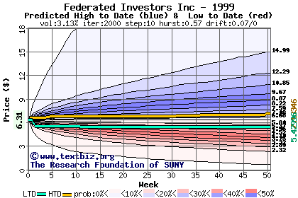 The high to date and low to date prices of the stock plotted against a random walk model for 1999 (what's this?).