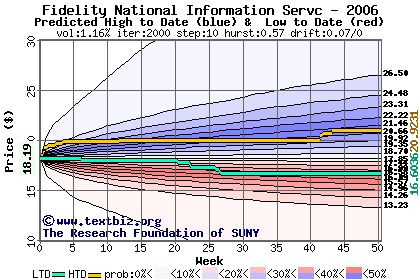 The high to date and low to date prices of the stock plotted against a random walk model for 2006 (what's this?).