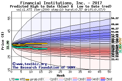 The high to date and low to date prices of the stock plotted against a random walk model for 2017 (what's this?).