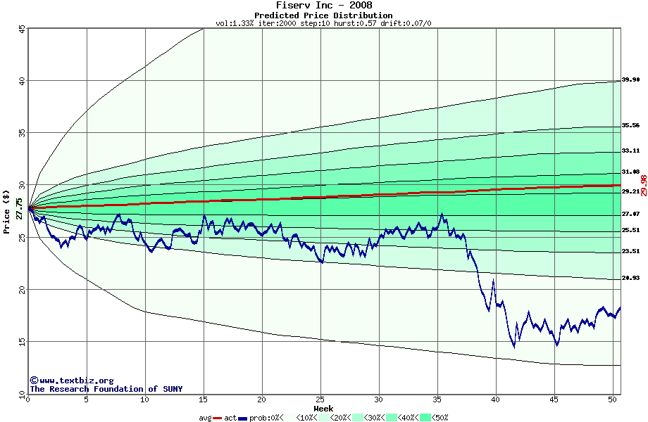 The following graph plots the year-to-date performance of the stock for 2008 compared to the probability calculated by a random walk model.