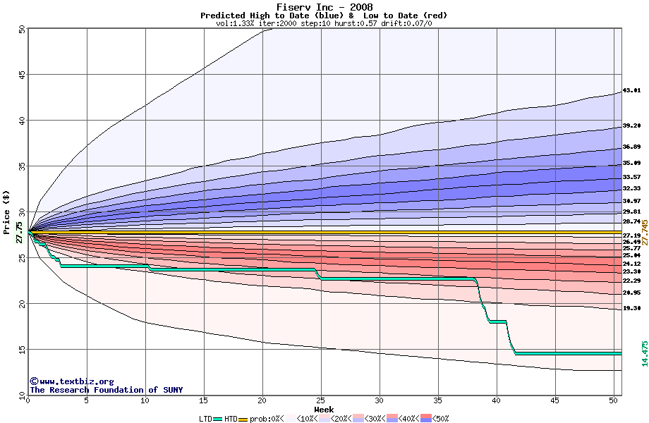 The high to date and low to date prices of the stock plotted against a random walk model for 2008 (what's this?).