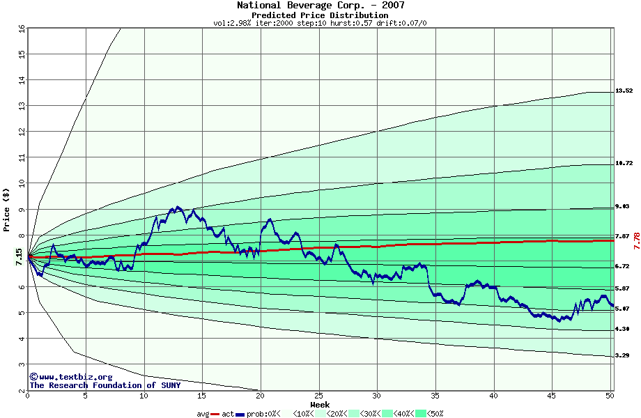 The following graph plots the year-to-date performance of the stock for 2007 compared to the probability calculated by a random walk model.