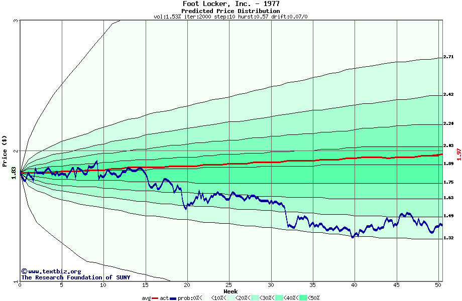 The following graph plots the year-to-date performance of the stock for 1977 compared to the probability calculated by a random walk model.