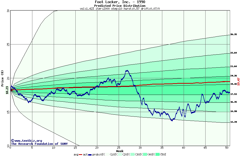 The following graph plots the year-to-date performance of the stock for 1990 compared to the probability calculated by a random walk model.