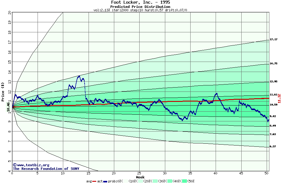 The following graph plots the year-to-date performance of the stock for 1995 compared to the probability calculated by a random walk model.