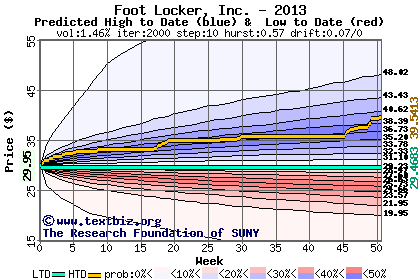 The high to date and low to date prices of the stock plotted against a random walk model for 2013 (what's this?).