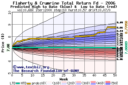 The high to date and low to date prices of the stock plotted against a random walk model for 2006 (what's this?).