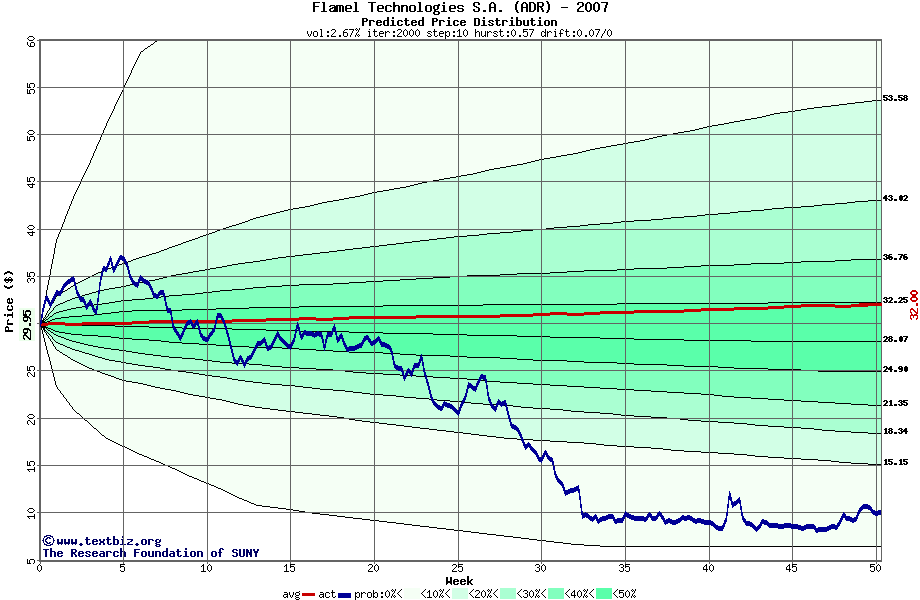 The following graph plots the year-to-date performance of the stock for 2007 compared to the probability calculated by a random walk model.