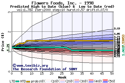 The high to date and low to date prices of the stock plotted against a random walk model for 1998 (what's this?).