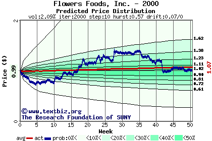 The high to date and low to date prices of the stock plotted against a random walk model for 2000 (what's this?).