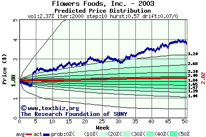The high to date and low to date prices of the stock plotted against a random walk model for 2003 (what's this?).