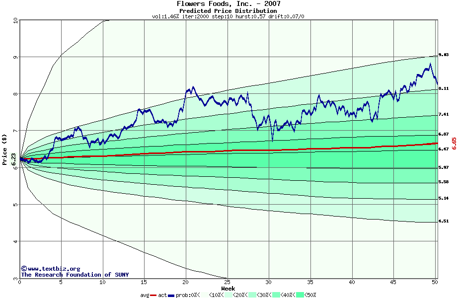 The following graph plots the year-to-date performance of the stock for 2007 compared to the probability calculated by a random walk model.