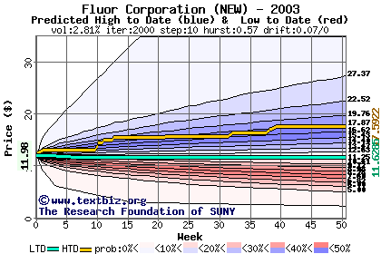 The high to date and low to date prices of the stock plotted against a random walk model for 2003 (what's this?).
