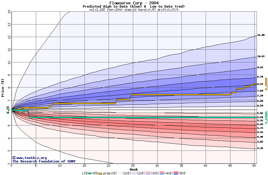 The high to date and low to date prices of the stock plotted against a random walk model for 2004 (what's this?).