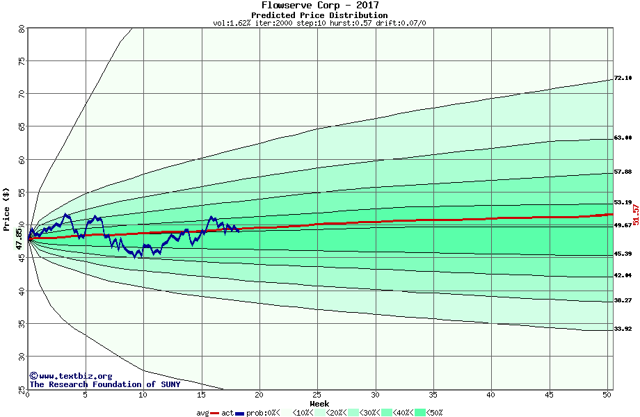 The high to date and low to date prices of the stock plotted against a random walk model for 2017 (what's this?).
