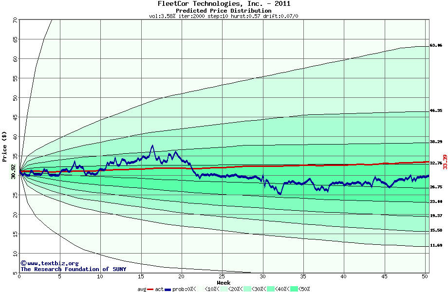 The following graph plots the year-to-date performance of the stock for 2011 compared to the probability calculated by a random walk model.