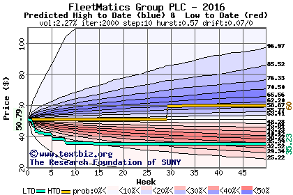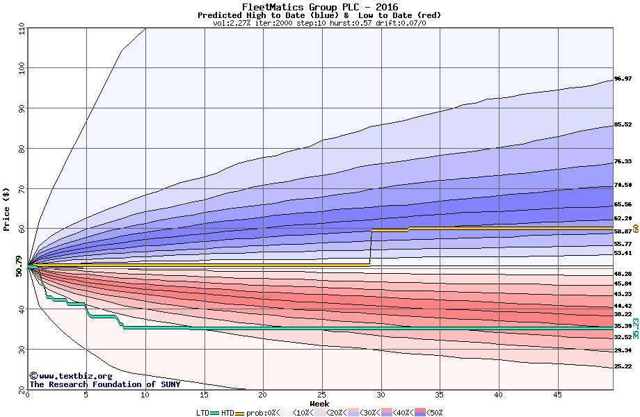 The high to date and low to date prices of the stock plotted against a random walk model for 2016 (what's this?).