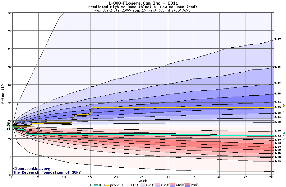 The high to date and low to date prices of the stock plotted against a random walk model for 2011 (what's this?).
