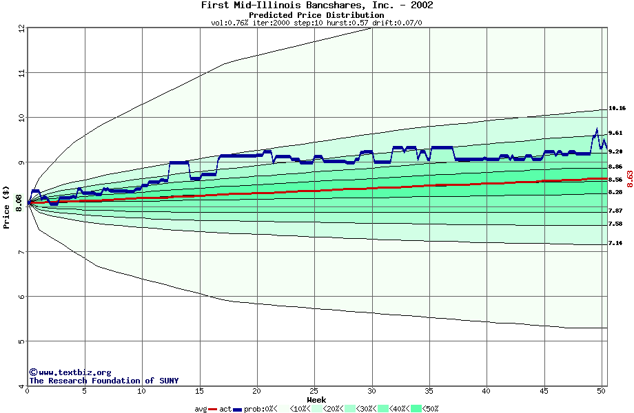 The following graph plots the year-to-date performance of the stock for 2002 compared to the probability calculated by a random walk model.