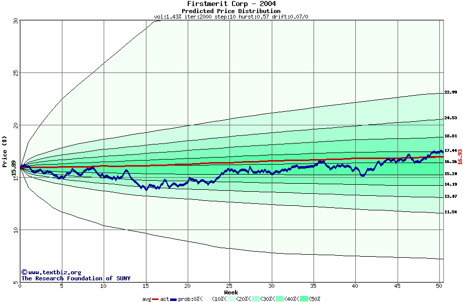 The following graph plots the year-to-date performance of the stock for 2004 compared to the probability calculated by a random walk model.