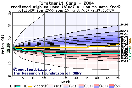 The high to date and low to date prices of the stock plotted against a random walk model for 2004 (what's this?).