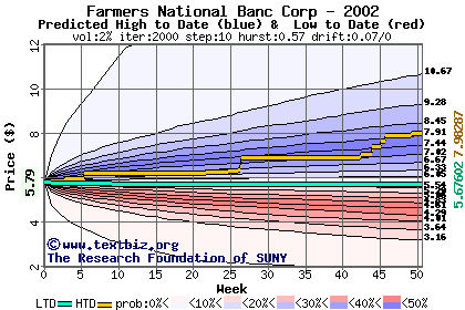 The high to date and low to date prices of the stock plotted against a random walk model for 2002 (what's this?).