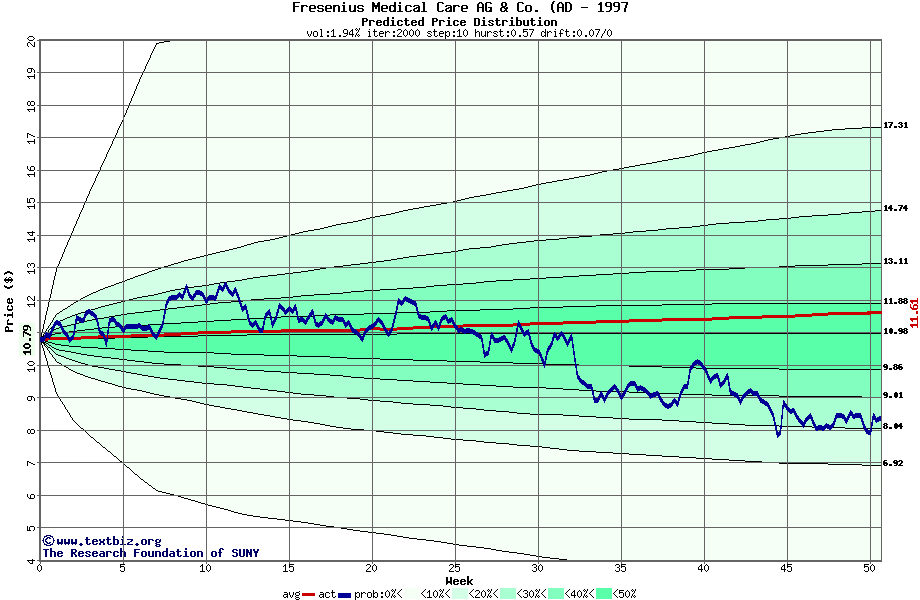 The following graph plots the year-to-date performance of the stock for 1997 compared to the probability calculated by a random walk model.