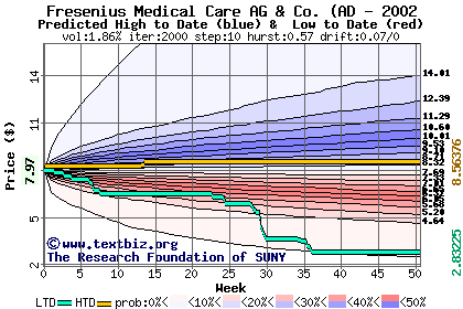 The high to date and low to date prices of the stock plotted against a random walk model for 2002 (what's this?).
