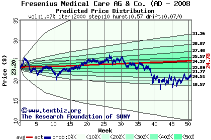 The high to date and low to date prices of the stock plotted against a random walk model for 2008 (what's this?).