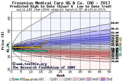 The high to date and low to date prices of the stock plotted against a random walk model for 2017 (what's this?).