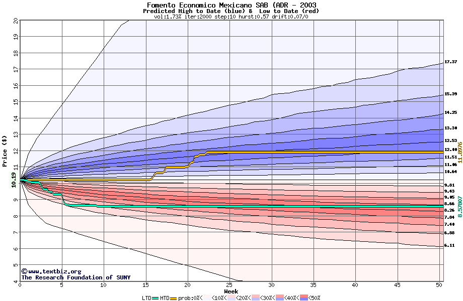 The high to date and low to date prices of the stock plotted against a random walk model for 2003 (what's this?).