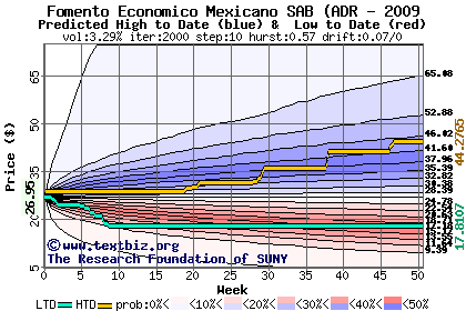 The high to date and low to date prices of the stock plotted against a random walk model for 2009 (what's this?).