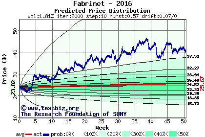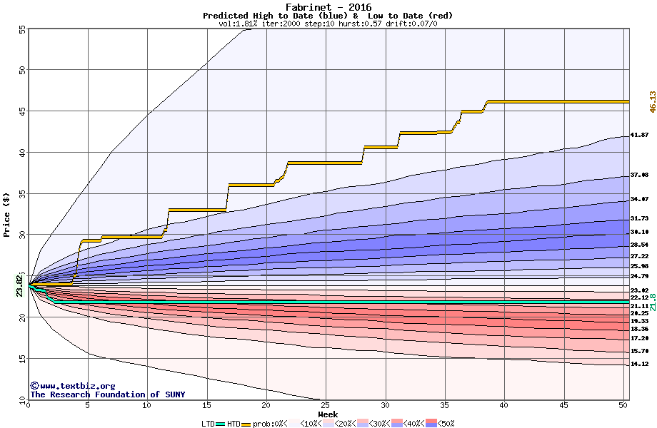 The high to date and low to date prices of the stock plotted against a random walk model for 2016 (what's this?).