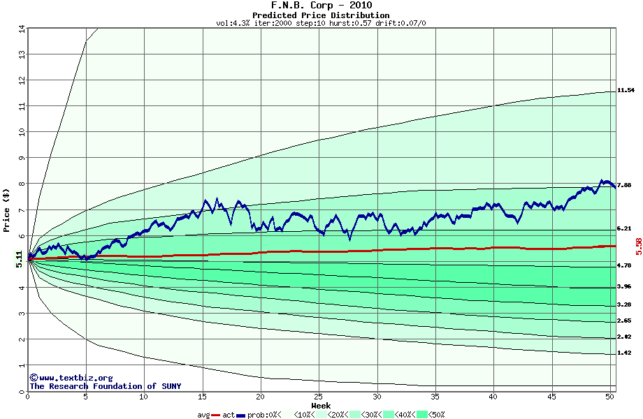 The high to date and low to date prices of the stock plotted against a random walk model for 2010 (what's this?).