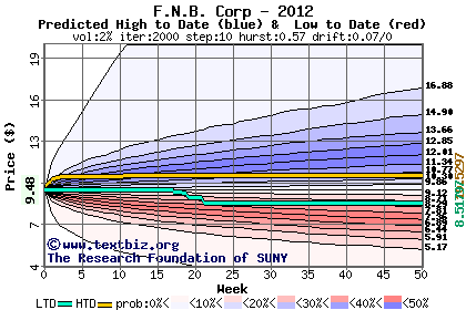 The high to date and low to date prices of the stock plotted against a random walk model for 2012 (what's this?).