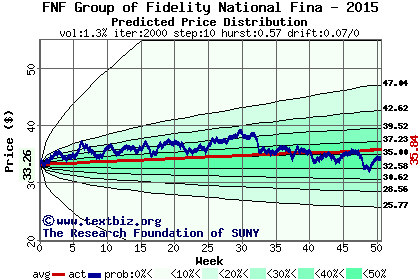 The high to date and low to date prices of the stock plotted against a random walk model for 2015 (what's this?).