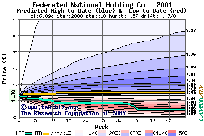 The high to date and low to date prices of the stock plotted against a random walk model for 2001 (what's this?).