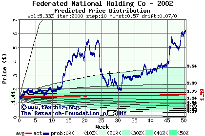 The high to date and low to date prices of the stock plotted against a random walk model for 2002 (what's this?).