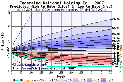 The high to date and low to date prices of the stock plotted against a random walk model for 2007 (what's this?).