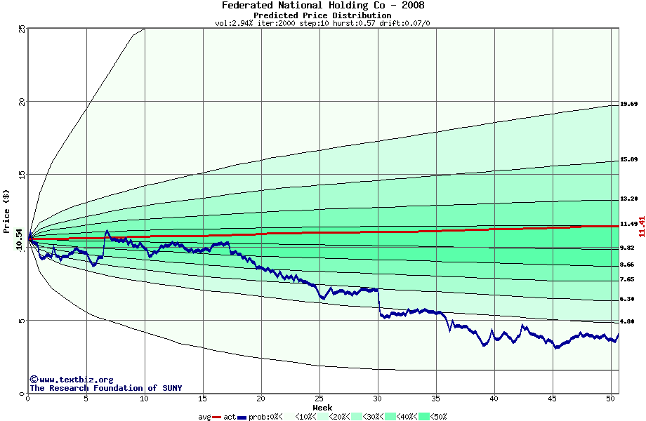 The following graph plots the year-to-date performance of the stock for 2008 compared to the probability calculated by a random walk model.