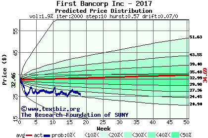 The high to date and low to date prices of the stock plotted against a random walk model for 2017 (what's this?).