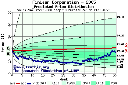 The following graph plots the year-to-date performance of the stock for 2005 compared to the probability calculated by a random walk model.