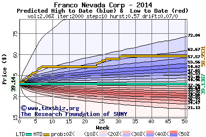 The high to date and low to date prices of the stock plotted against a random walk model for 2014 (what's this?).