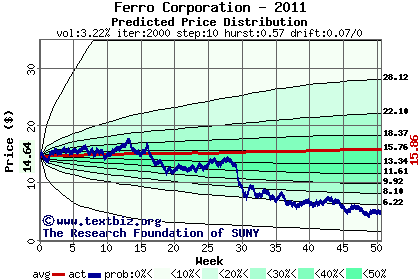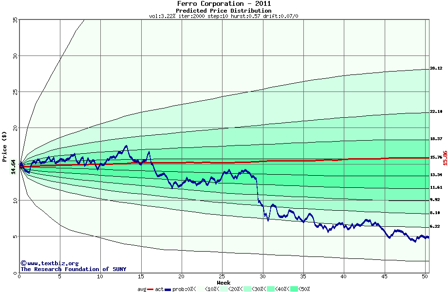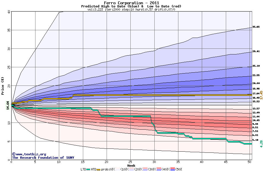 The high to date and low to date prices of the stock plotted against a random walk model for 2011 (what's this?).