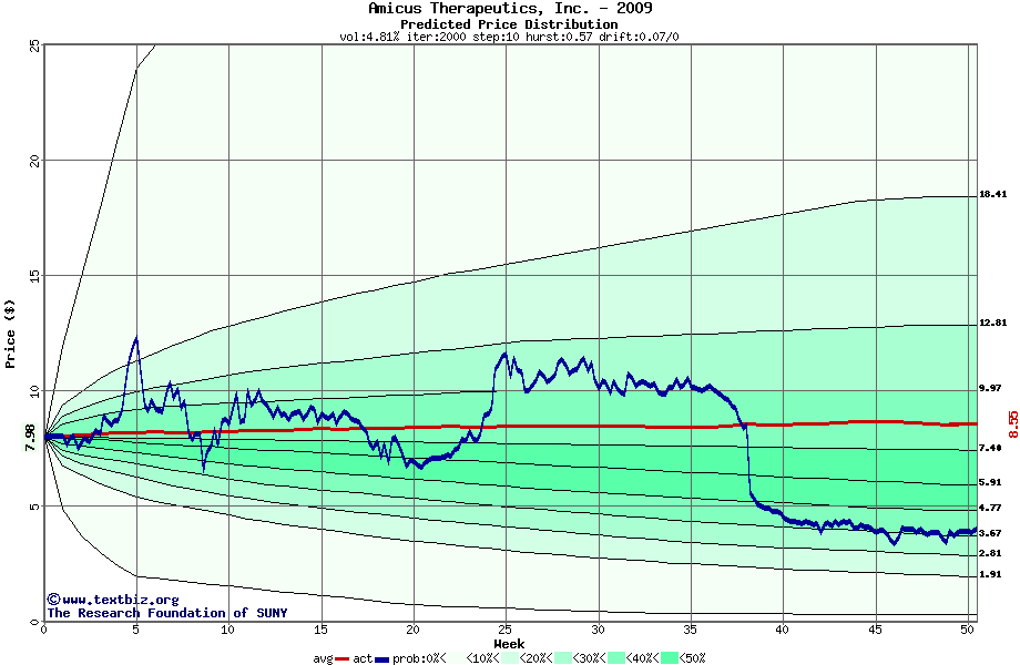 The following graph plots the year-to-date performance of the stock for 2009 compared to the probability calculated by a random walk model.