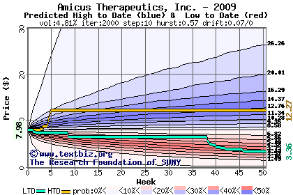 The high to date and low to date prices of the stock plotted against a random walk model for 2009 (what's this?).