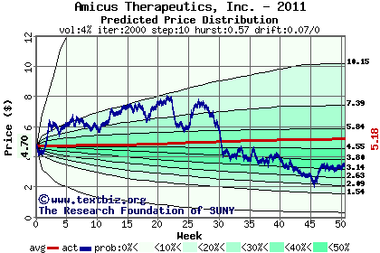 The high to date and low to date prices of the stock plotted against a random walk model for 2011 (what's this?).