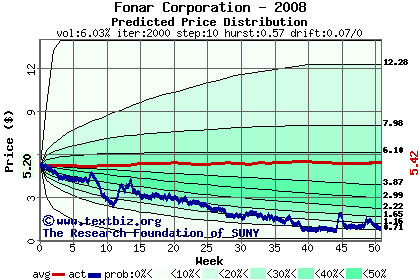 The high to date and low to date prices of the stock plotted against a random walk model for 2008 (what's this?).