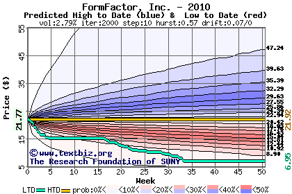 The high to date and low to date prices of the stock plotted against a random walk model for 2010 (what's this?).