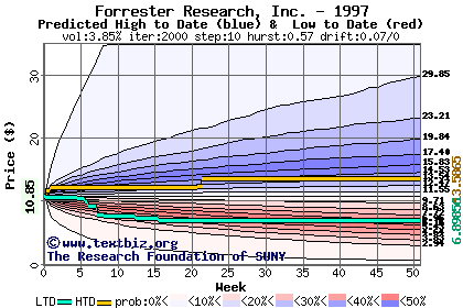 The high to date and low to date prices of the stock plotted against a random walk model for 1997 (what's this?).